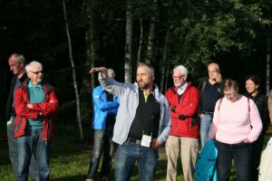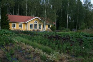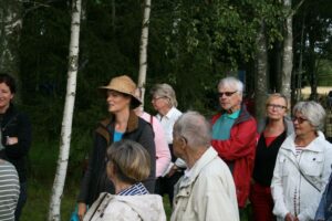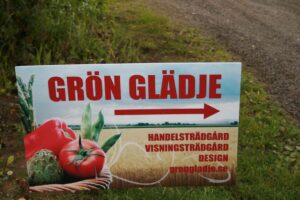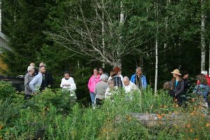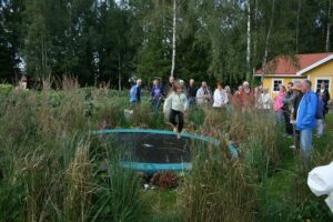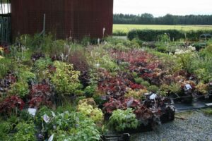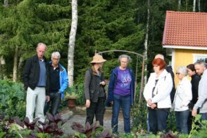 Lena och David Falk tog emot ett 30-tal VTS-medlemmar en skön kväll i augusti. David berättade om handelsträdgårdens utveckling. De utvidgar vartefter och idag finns växthus och en jordkällare där bl.a. snittblommor förvaras en natt innan det är dags att åka till Bondens marknad. Radodling av framförallt snittblommor sker på en intilliggande åker. Planerna för ett café har kommit så långt att betongfundamenten redan är gjutna. Buskar och perenner fanns till försäljning.