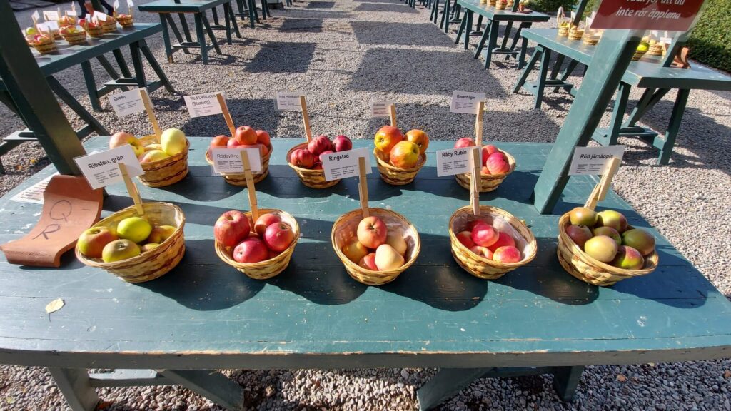 Den traditionella äppelutställningen med sortbestämning ägde rum i helgen på Vallby Friluftsmuseum. Då det fortfarande är coronarestriktioner så var utställningen placerad ute på gårdsplanen framför Herrgården. Äpplen som skulle sortbestämmas lämnades till volontärer från VTS som i sin tur levererade in till pomologerna inne i Herrgården. Besked lämnades sedan via telefon eller sms till inlämnaren.