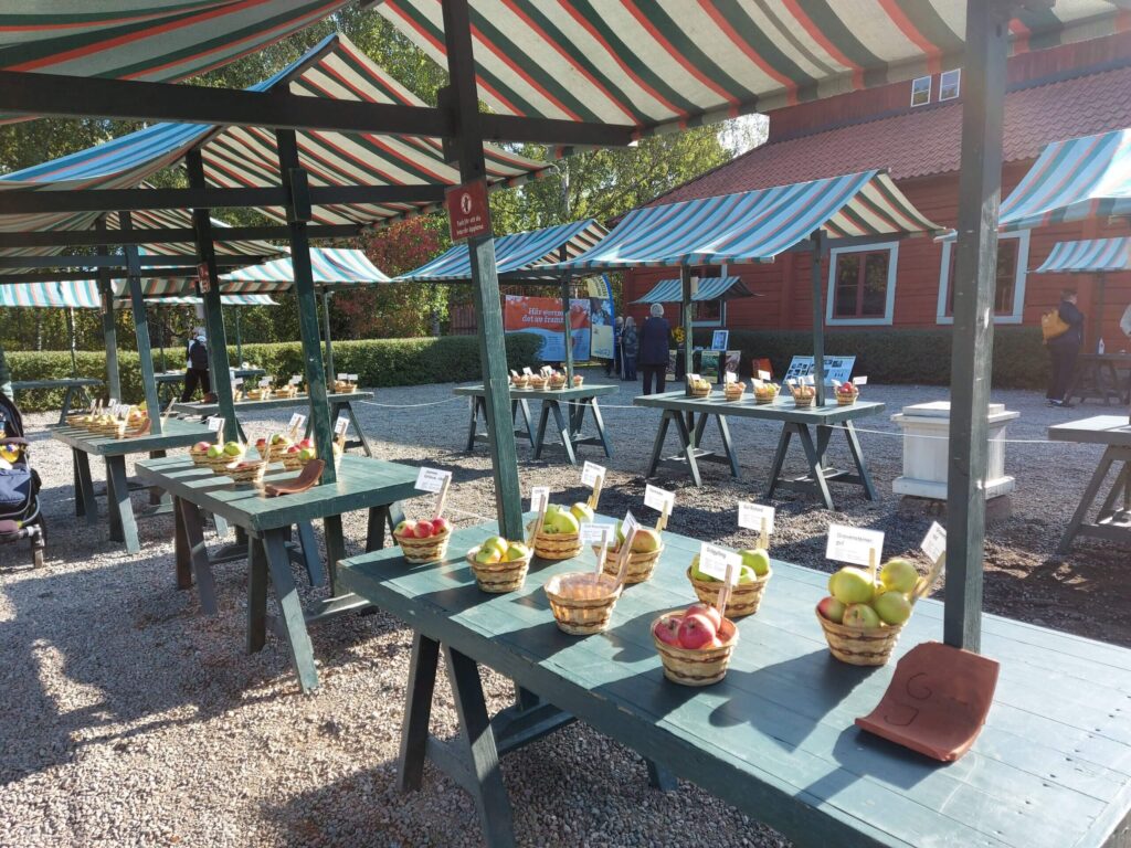 Traditionsenligt anordnades äppeldagar på Vallby Friluftsmuseum. Den här gången blev genomförandet inte likt tidigare år då vi behövde ta hänsyn till de restriktioner som gäller under coronatider. Själva utställningen fanns på grusplanen framför Herrgården och de som lämnade in äpplen för sortbestämning fick göra det vid föreningsbordet och fylla i en blankett med uppgifter. Allt