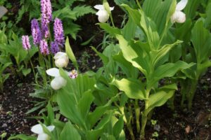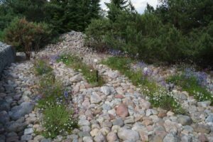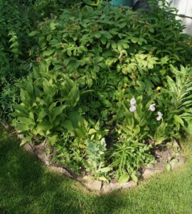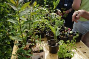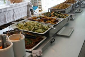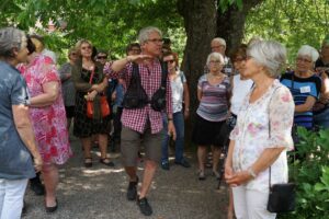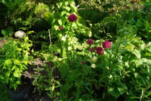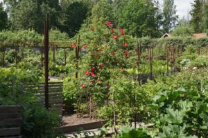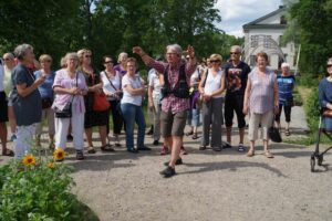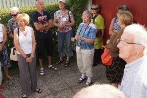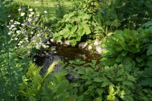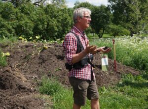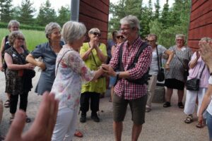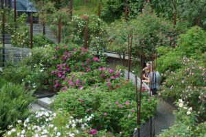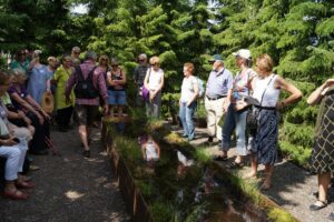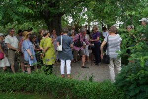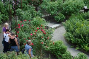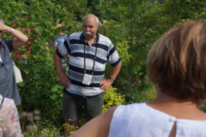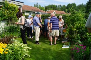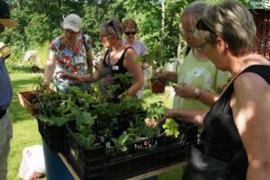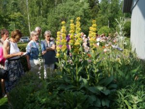 På Wij trädgårdar väntade en dignande lunchbuffé som tillfredsställde alla kostinriktningar. Därefter blev vi guidade av Lars Krantz. Han började med att berätta om hur han kom till Wij och hur trädgården har utvecklats under hans tid. Vi fick lära oss hur man får kinkiga rosor att trivas i växtzon 4-5 fast de egentligen borde ha stannat i södra Sverige. Under rundvandringen berättade han många anekdoter om de olika trädgårdarna. Han framhöll också vikten av att ha en levande kompost. Rundturen avslutades i ”Skogens trädgård” designad av Ulf Nordfjäll.