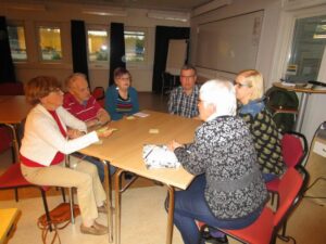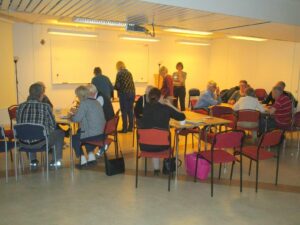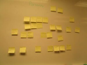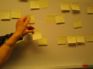 Vi startade med att gemensamt ta fram idéer om innehåll i trädgårdsträffarna. PostIt lapparna användes flitigt och organiserades på tavlan. Resultatet blev att två grupper bildades där deltagarna kommer att besöka varandras trädgårdar för att utbyta tankar och idéer.