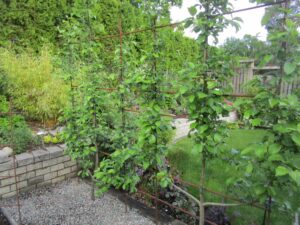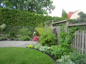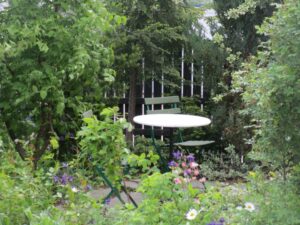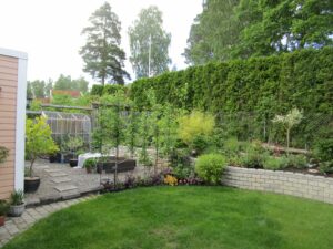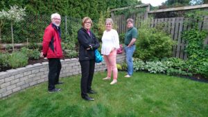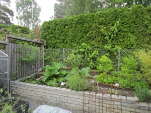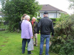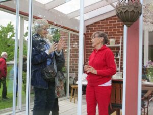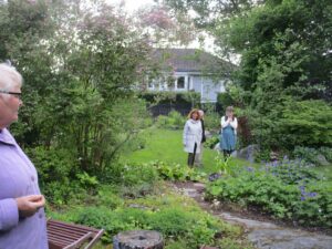 Det var spännande att besöka två trädgårdar som var så olika varandra. Vi började i radhusträdgården som Åsa Henriksson hade ritat 2012 när de flyttade dit. I mitten en rundel med gräs och rabatter runt om. En avdelning med köksväxter och spaljerade äppelträd fick också plats. En mur bildade en terrasserad bakgrund till grannarnas tujahäck.