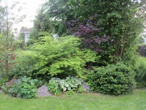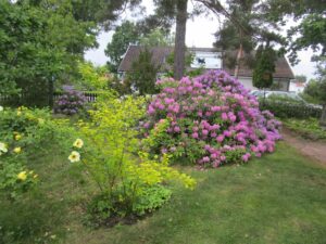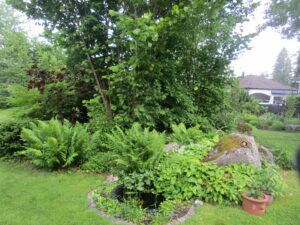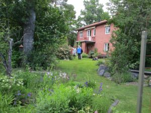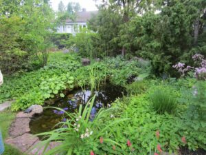 I nästa trädgård var det ytorna som dominerade. En äldre trädgård som sköts om i många år av Kerstin och Boy Nyman. Även här många olika växter men också stora träd och buskar. Fantastisk blomning på rododendron men också rosor när vi var där.