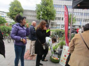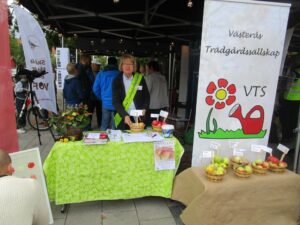 Vår målsättning var att marknadsföra föreningen. Vi tog en del äppelkorgar med oss från utställningen på Vallby och anordnade en liten gissningstävling om antalet fröer i en glasburk, vinster var tre äppelaffischer. Bilderna nedan blev tagna precis när vi ställt upp sakerna vid 18 tiden, sen hann vi inte då det var mycket folk att prata med.